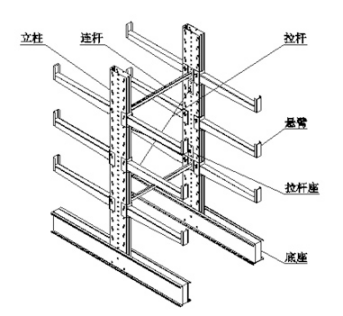主要由立柱、底座、悬臂牛腿、拉杆系统构成,在使用中可分为单面悬臂和双面悬臂,通常平库用的悬臂货架高度在10m以内,立体仓库悬臂货架可以达到10米以上。每个悬臂牛腿的承载一般在1.5吨以内,立柱间的距离通常设计为1m~1.5m(根据货物尺寸及重量等因素)。对于较高的悬臂货架,建议立柱顶部使用龙门梁相互连接以提高安全性。